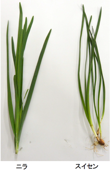 | ・ニラの葉には特有の臭いがあるが、スイセン等の葉にはニラ臭はない。 ・ニラの葉の先端は薄く断面は扁平であるが、スイセンの葉は先端まで厚みがあり、断面は中央部がへこんだV字型である。 ・それぞれ異なる花をつける。 ・スイセンの地下部には、丸い球根(鱗茎)がある。 参考:農林水産省HP http://www.maff.go.jp/j/syouan/nouan/rinsanbutsu/pdf/01nira.pdf |